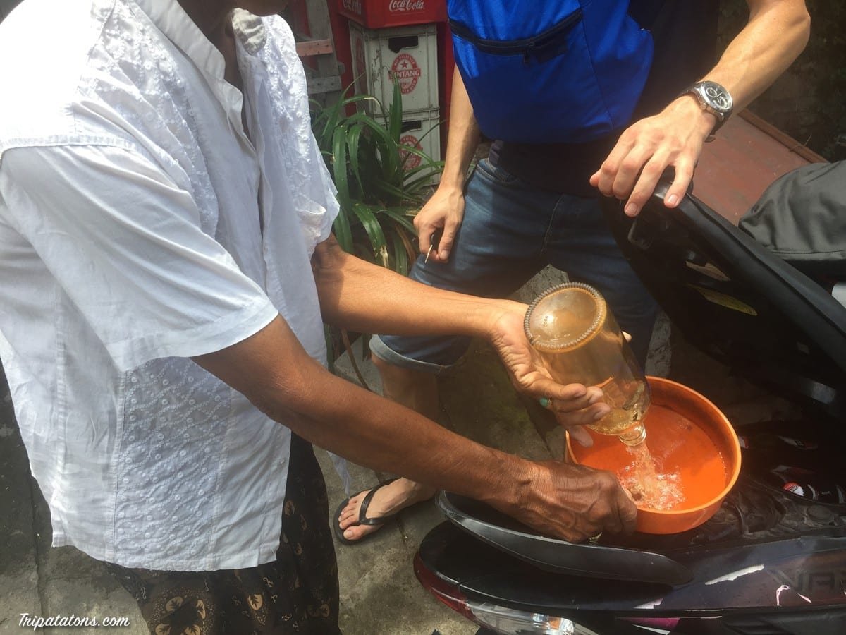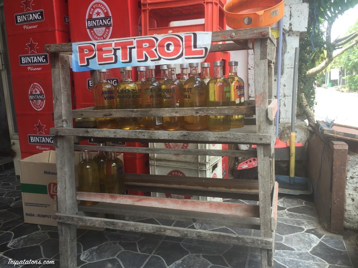 N’hésitez pas à faire le plein de votre scooter dans les petites boutiques qui vendent l’essence dans de vieilles bouteilles de Vodka. Ce n’est apparemment pas très conseillé car ils coupent parfois avec un autre produit mais une Française qui vit là-bas depuis 10 ans nous a dit que c’était plutôt sûr et malheureusement amené à disparaître avec les grosses stations (alors que ça les aide beaucoup en leur faisant un peu de sous). Et puis c’est original de rouler à la Vodka 🙂