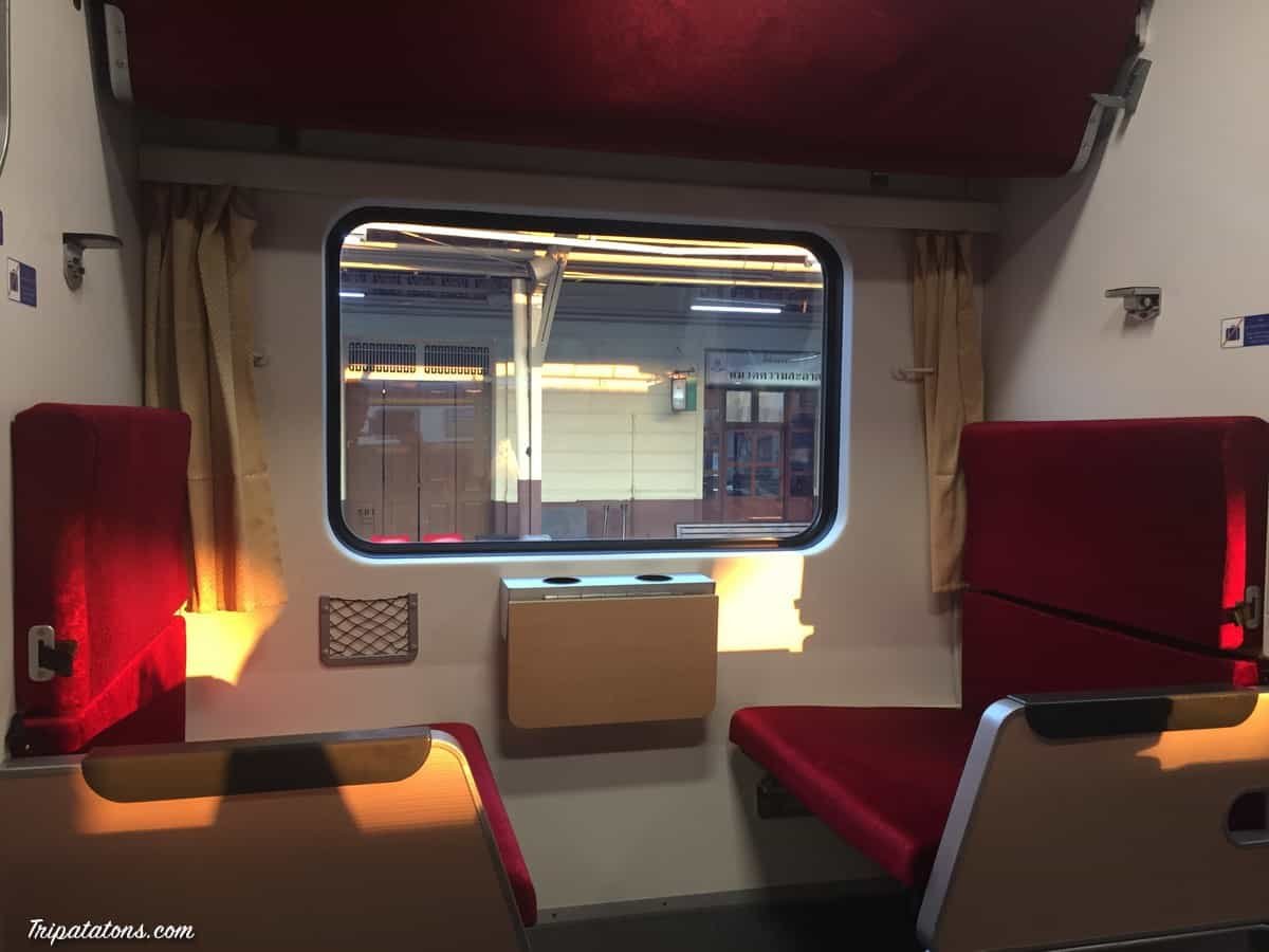 Nous montons dans le train. Nous sommes surpris car l’intérieur est tout neuf. Nous avons un petit compartiment ouvert avec un genre de  banquettes superposées. Les 2 sont dé-pliablables pour un espace « salon ».