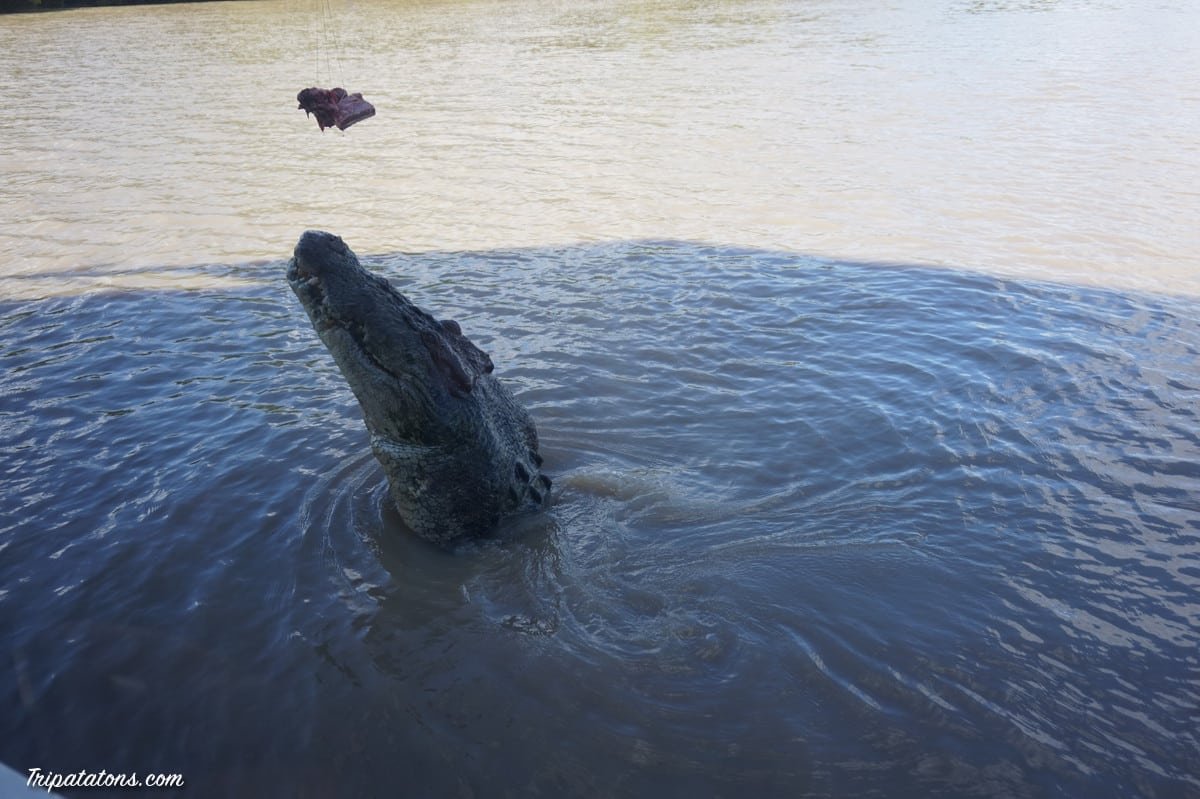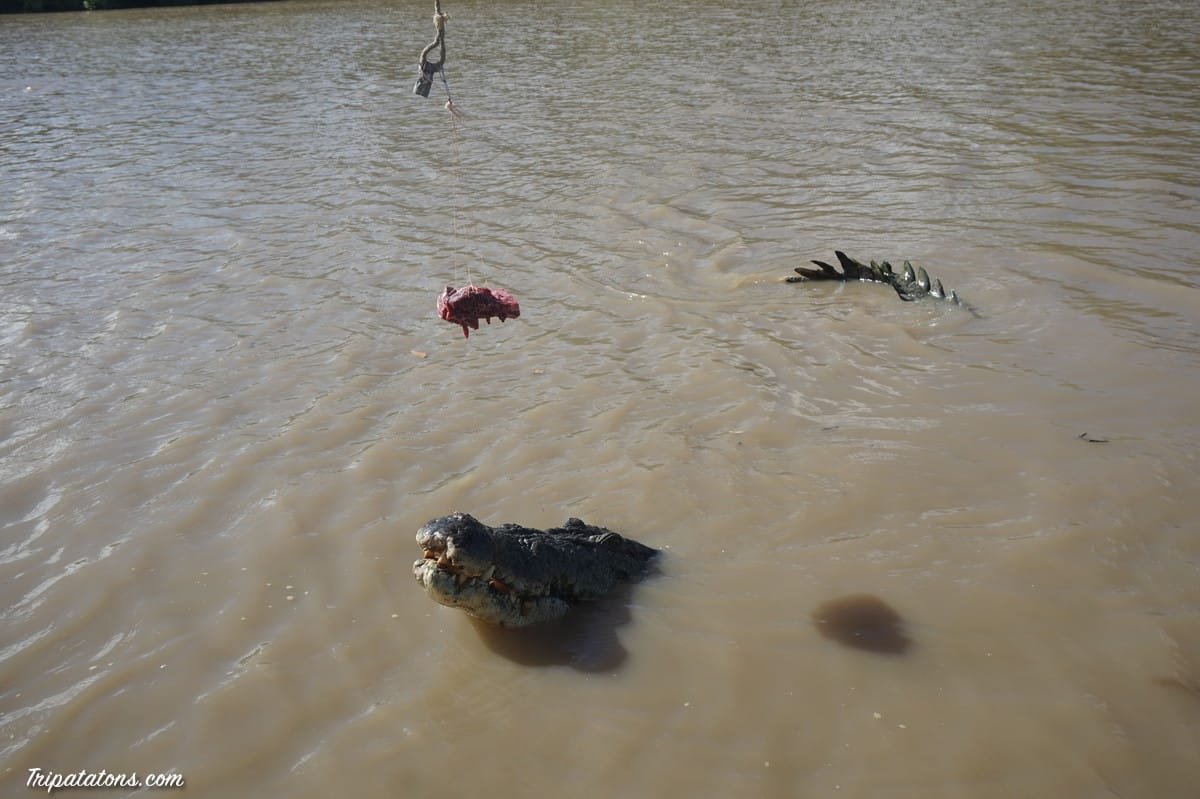 Avec 3 autres Français, nous embarquons à 9h pour 1h de navigation sur une rivière pleine de crocos. En fait, les gens de l’organisation attachent un bout de viande au bout d’une sorte de canne à pêche et la tiennent en l’air afin que les crocodiles puissent sauter pour se nourrir et nous ébahir en même temps !