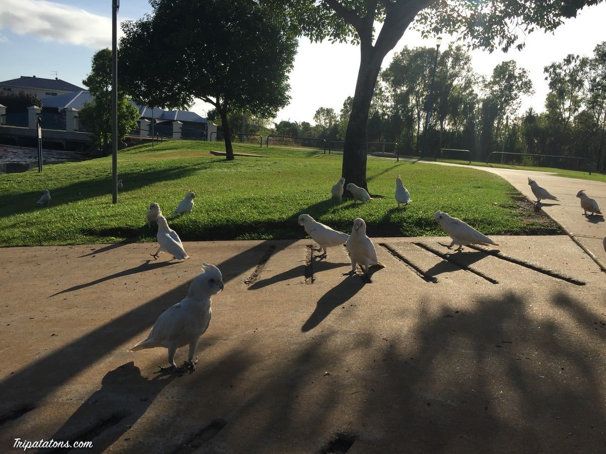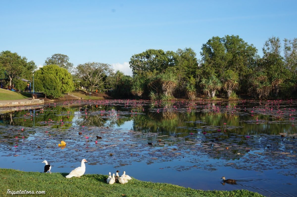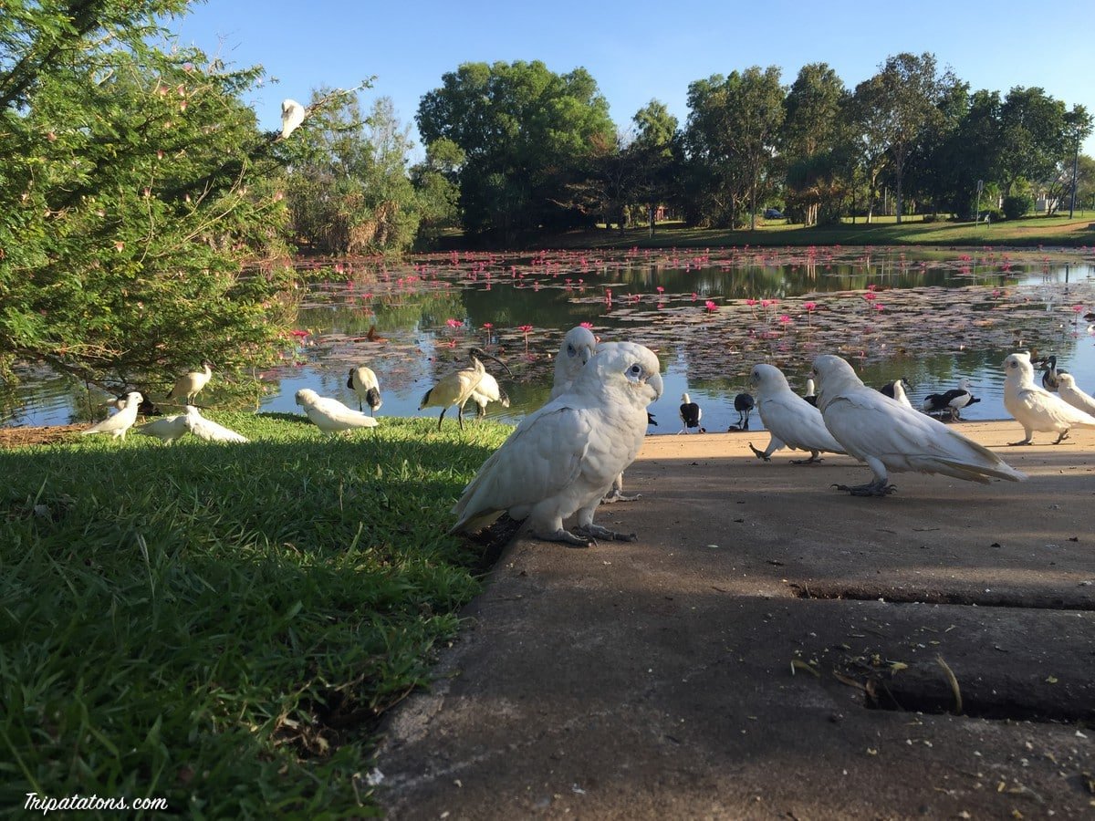 Nous avons découvert un parc sympa aux environs de Palmerston dans lequel nous adorons passer du temps. Ici les canards, cacatoès et ibis s’amusent et gazouillent toute la journée.