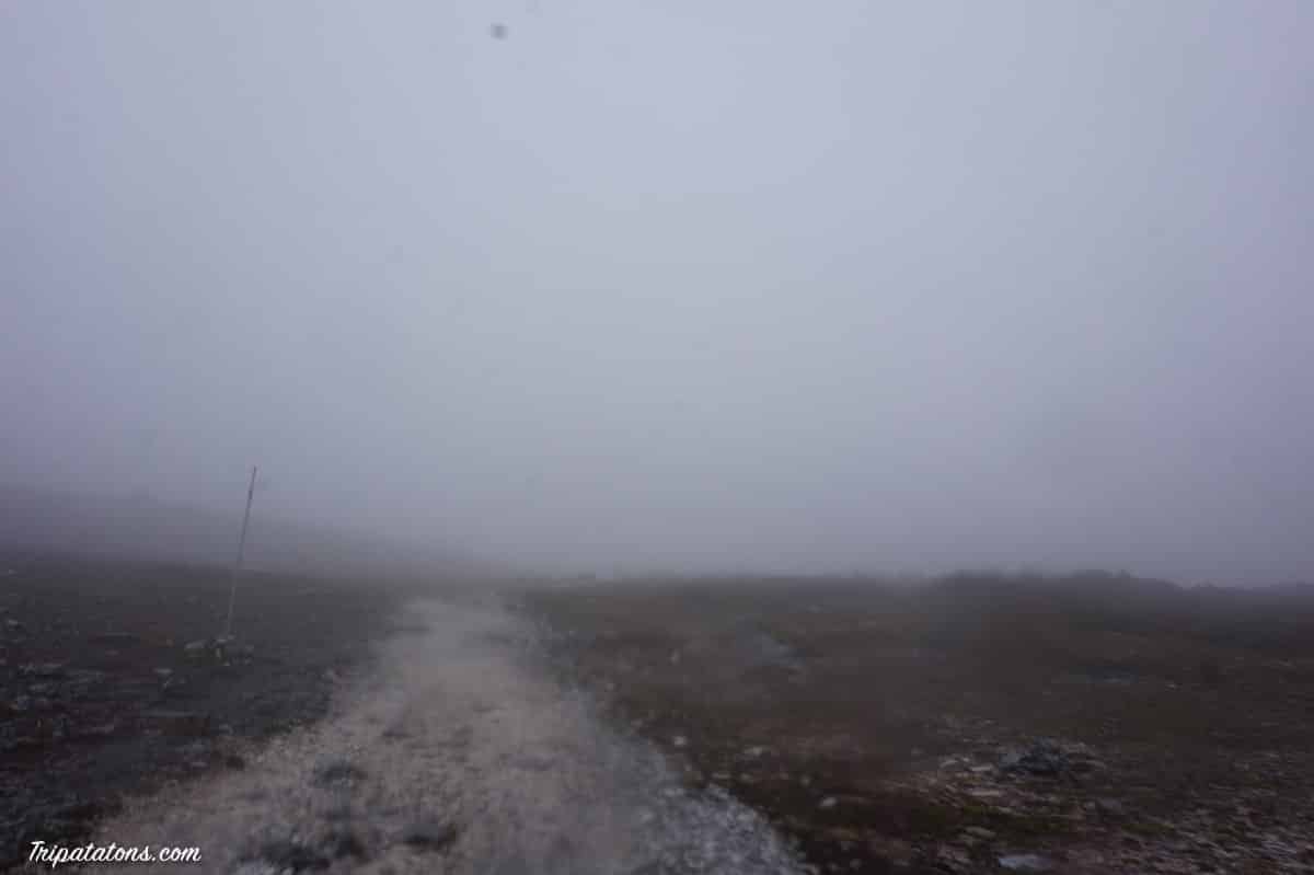 Alexia redescend et je me lance le défi de monter jusqu’au sommet. Je n’ai trouvé personne pour m’accompagner alors j’y vais en solo. Après quelques centaines de mètres, il fait encore plus froid, le vent est glacial, il pleut un peu et surtout le brouillard débarque.