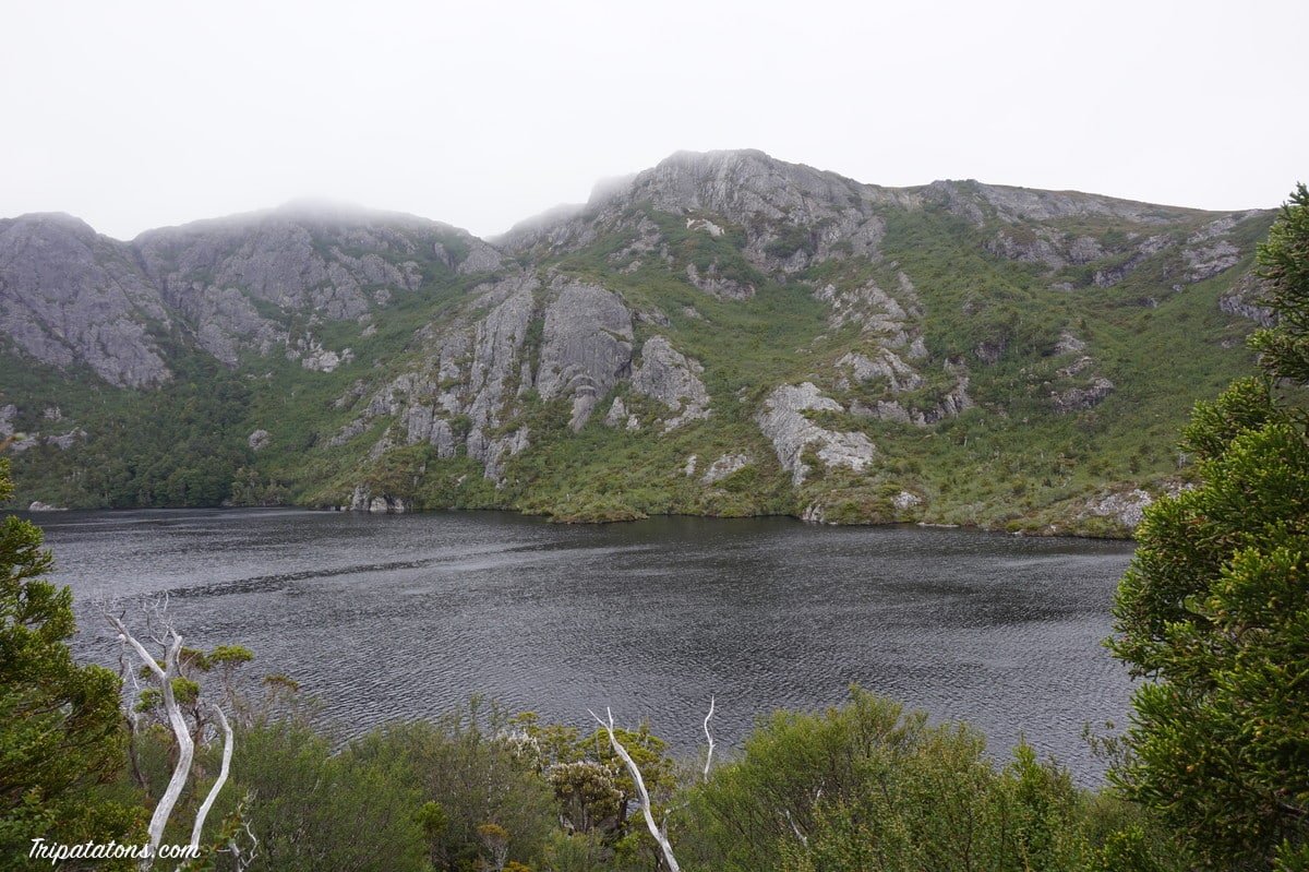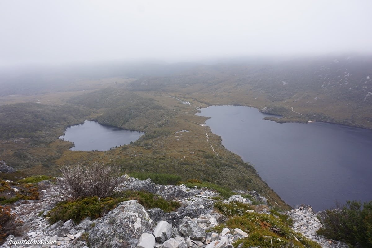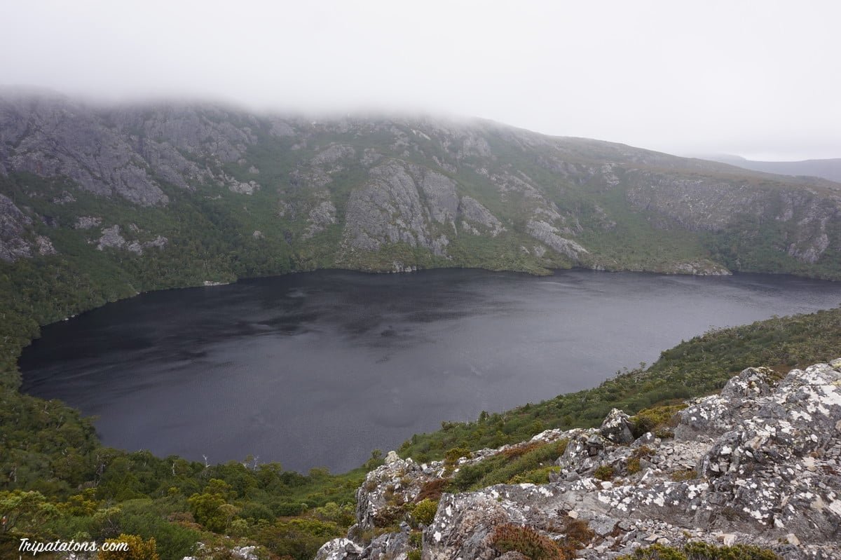 Il ne faut pas s’approcher trop près du bord car les bourrasques ont vite fait de vous faire déraper. Après quelques mètres, je croise 4 Allemands et leur demande la situation un peu plus haut. A les croire, c’est apocalyptique : toujours du brouillard, le vent se ressent encore plus, ça monte à pic, les rochers sont trempés donc ça glisse. Déjà qu’il n’y a pas de réception et qu’on ne voit pas à 20m, je joue la carte de la prudence et fait demi-tour aussi. La tempête me poursuit un long moment et me laisse tranquille une fois que j’ai passé le Marions Lookout par le chemin qui descend à Dove Lake (pour être sûre d’en voir un bout ! ).