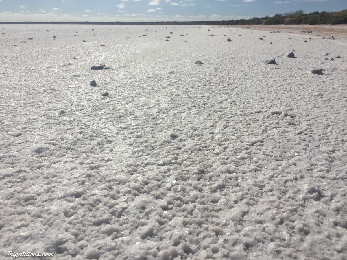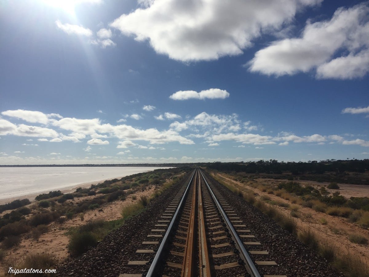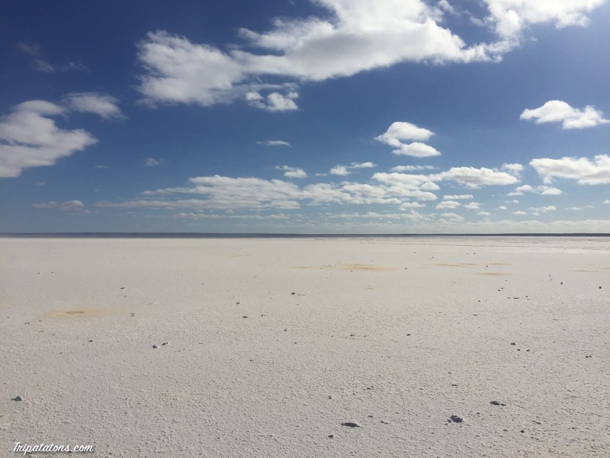 Je m’arrête au bord du lac Hart. C’est un immense lac salé, traversé par une voie ferrée. Apercevant des traces de voitures sur le sol, je me dis : lance toi, prend le 4×4 et roule dessus ! Quelques minutes plus tard je rebrousse chemin car je m’enlise (courageux mais pas téméraire). Du coup je termine mon petit tour à pied.