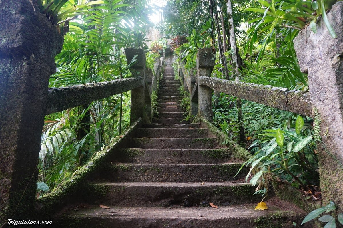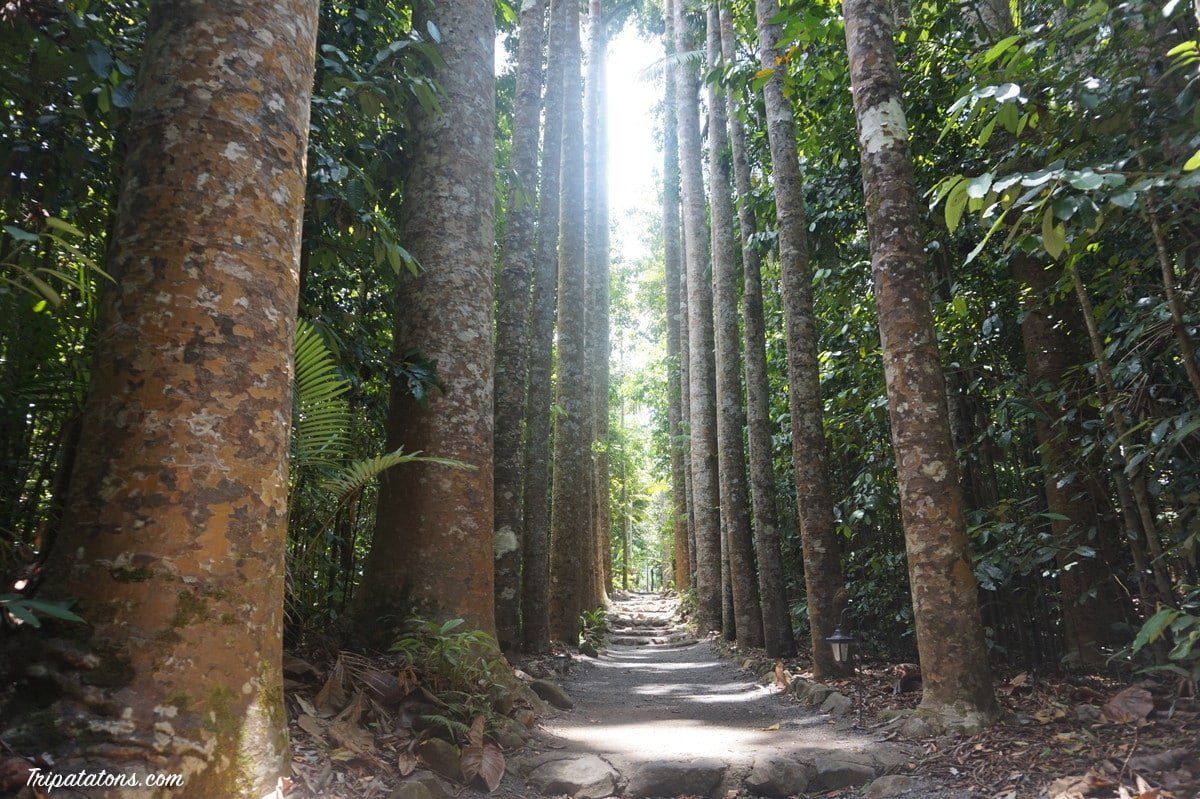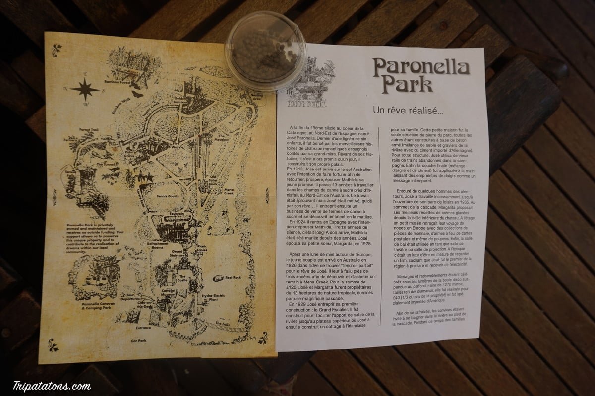 Paronella Park est un lieu qui abrite les ruines d’un château espagnol des années 30 et tout ce qu’il y avait avec (théâtre, cours de tennis, espace de pique-nique…). Cet Espagnol, José Paronella, avait un rêve : construire un bâtiment magnifique dans un lieu magique, pour y vivre heureux avec sa femme Matilda. Il décida de rejoindre l’Australie pour y faire de l’argent dans les cannes à sucre. Il passa plus de 10 ans à travailler dur à l’autre bout de la terre et trouva son coin de paradis, au milieu de cette forêt. De retour en Espagne, Matilda, sans même une lettre pendant une grosse décennie, était déjà mariée. Il épousa donc sa petite sœur Magarita. Avec les matériaux du coin, essentiellement de la pierre, du sable et des bouts de rails servant au transport de la canne à sucre par le train, il construisit sa propriété : un château inspiré des contes de fées que sa grand-mère lui racontait quand il était petit. Il y vécut avec sa femme et ses 2 enfants. C’est le premier bâtiment du coin a avoir eu de l’électricité, grâce au système de turbine relié aux chutes d’eau. C’est également parce que c’est un lieu qui offrait tout le confort recherché, que les voyageurs sur la route entre Cairns et Brisbane s’y arrêtaient. Il était possible de se baigner, de visiter des aquariums…