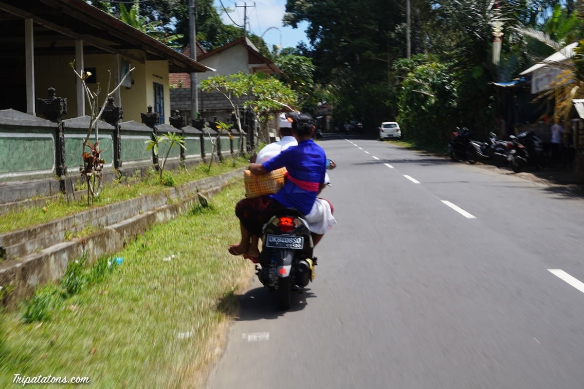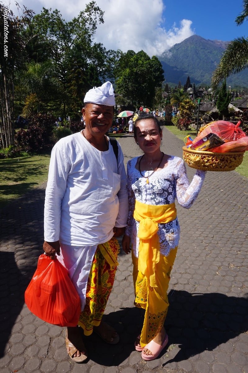 Nous avons croisés des centaines voire des milliers de Balinais en costumes traditionnels qui parcouraient les rues en scooter, filles et femmes en amazone, les bras chargés ! Ils apportaient des offrandes en tout genre dans les temples où ils venaient prier en famille.