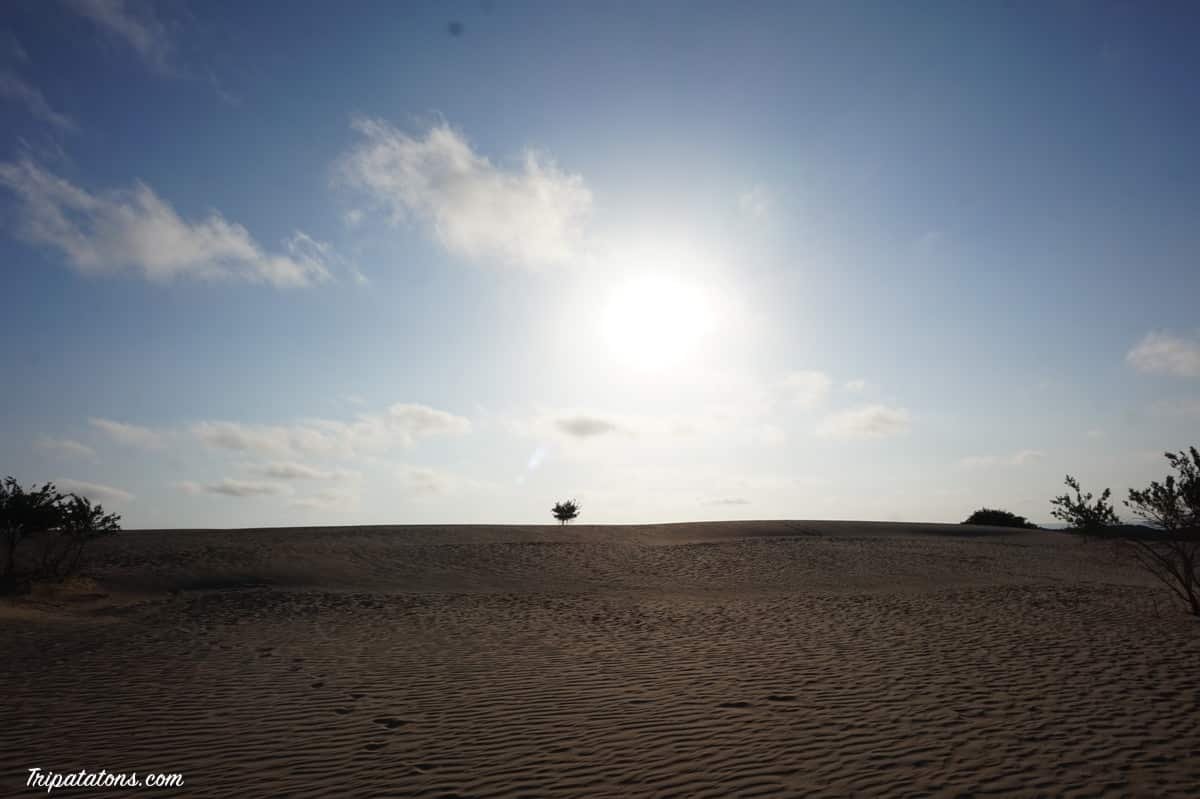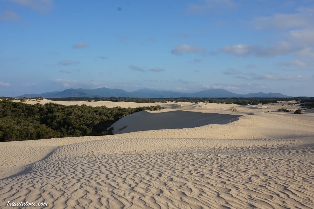 Au bout, des dunes de sable blanc à perte de vue. Nous restons un long moment à jouer dans le sable comme des enfants. C’est superbe ! Le soleil se couche trop tard, nous aurions aimé le voir mais il faut rentrer… Ca devait être chouette vu d’ici…