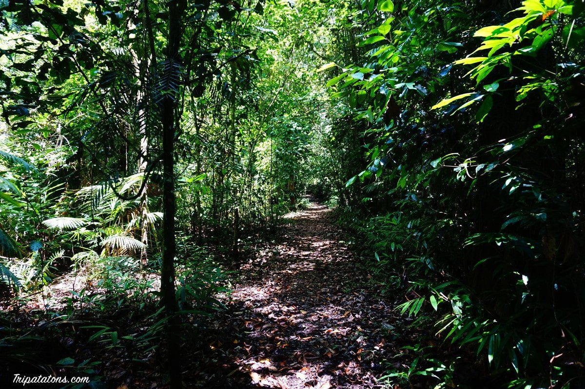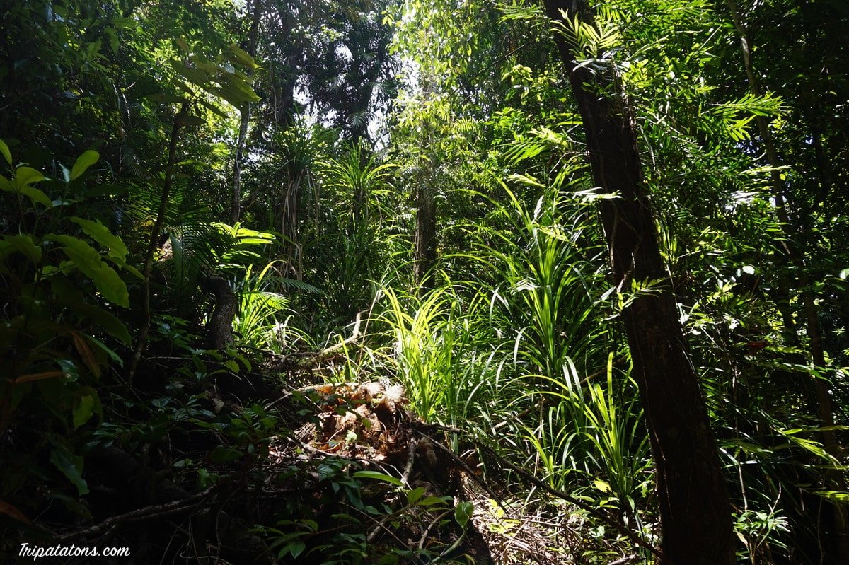 Je ne vais regretter mon choix qu’à moitié. En fait, vu le nombre de toiles d’araignées que je me prends dans le visage et l’état du chemin, je sais qu’il est rarement emprunté. Ce n’est donc pas aujourd’hui que je vais croiser quelqu’un. Je prends donc toutes les précautions possibles. Depuis le début, je remarque les bords du chemin abîmés, comme si un animal avait gratté. Impossible que ce soit les petites dindes, c’est bien trop large. Un kangourou n’a rien à faire ici. Alors peut-être un casoar… J’ouvre l’œil ! Et puis une fois bien enfoncée dans la forêt, j’entends un grognement sur ma droite. L’animal prend peur et part en courant, en prenant soin de laisser dévaler tous les cailloux sur le chemin ! En fait, ces animaux qui creusent ce sont des sangliers. En mode adrénaline à fond, je continue le chemin avec un bâton dans la main et une pierre dans l’autre hahaha la flipette !